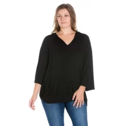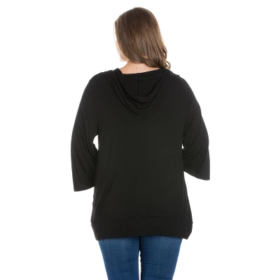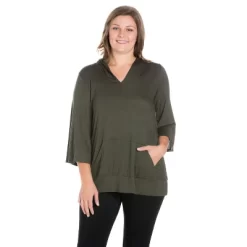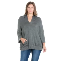 Relaxed and comfortable as can be, the 24seven Comfort Apparel Oversized Hoodie Top features ¾ length loose sleeves, front pocket, v-neck, and a trendy look. This women’s fashion plus size hoodie is perfect for a relaxed day.