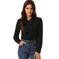 Simple and delicate, this blouse features a bow tie neck, long puff sleeves, and solid color. This nice and neat blouse gives office chic a whole new meaning. Simple and vintage, this top is a good option for your next workday. Designed to be versatile, this piece is perfect for work, holidays, and everywhere in between. Adorned with a bow tie neck, simply add tailored trousers and point-toe heels for a smart-casual finish. Material: Lavender/Pink/Burgundy/Yellow: 100% Polyester; White/Black/Grey Blue/Dark Green: 100% Rayon.