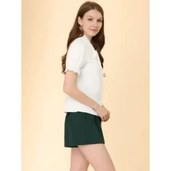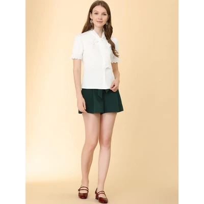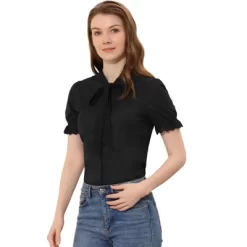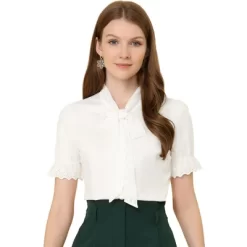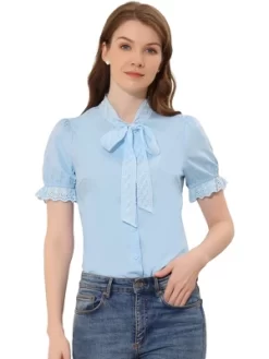 - Bow Tie Neck, Ruffle Lace Trim Short Sleeve, Cotton Fabric, Work Office Button Down Shirts