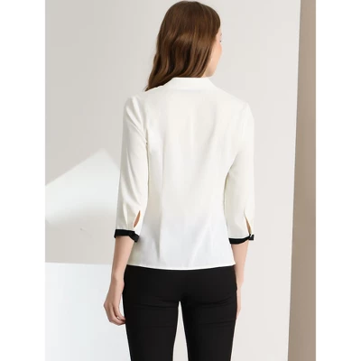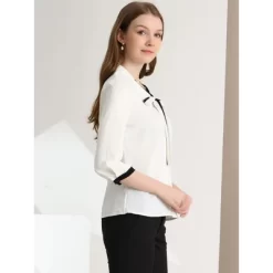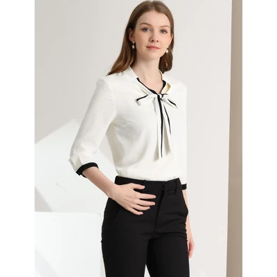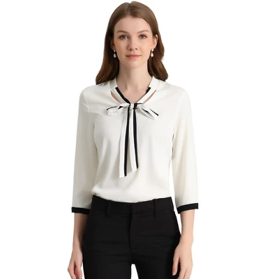 Chic and vintage, this top is a good option for your next workday.Simple and delicate, this blouse features a bow tie-neck, 3/4 sleeve with contrast trim.This nice and neat blouse gives office chic a whole new meaning.Simply add tailored trousers and point-toe heels for a smart-casual finish.The tie-neck adds office-inspired sophistication, while the soft fabric gives it an elegant and feminine shape.