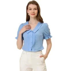 This summer top adds to your wardrobe for the upcoming seasons. An elegant top is effortless to be paired perfectly with a midi skirt and heels for a cute and casual impression. Everything about the summer tops is sweet—from the lapel v neck with pleated front to the ruffled short sleeves.