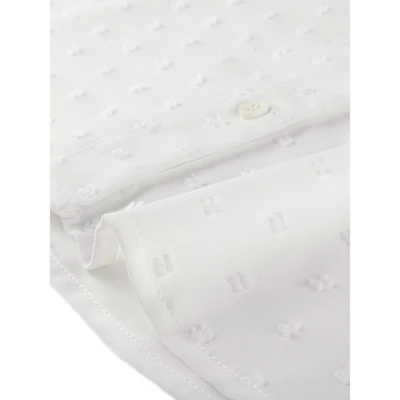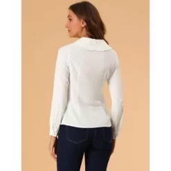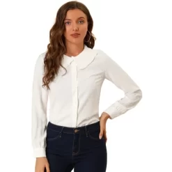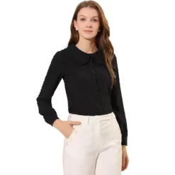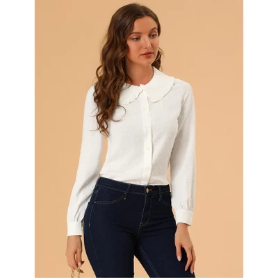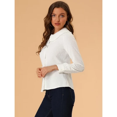 Add a touch of elegant, feminine style to your wardrobe with this beautiful soft blouse. A cute peter pan collar and charming solid color pattern artfully highlight the elegant style detailing of a shirt. Wear it with suit pants or pencil skirt and heels moving into a cooler season. Complete your chic style with this swiss dots work shirt!