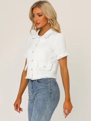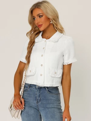 Women’s Tweed Shirt with Tassel Cropped Length Spring Short Sleeve Shirt. This white tweed shirt with tassel in the edge, is of simply timeless style. It feature button up at front, short sleeves, collared and faux pocket decoration. This button-up shirt is a polished piece for the weekend and workday alike. It is not only suitable for business, but also for casual going-out.