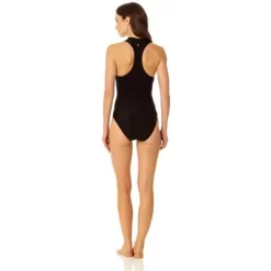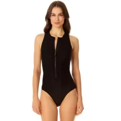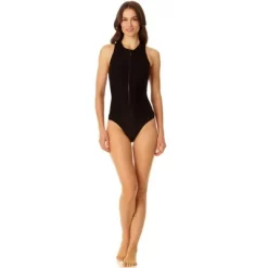Lounge at the beach in fresh style with this Coppersuit Zip Front High Neck One Piece, which will give you a sleek, sophisticated look. The swimsuit’s high neck cut and racerback cutout will flatter your frame and shoulders. This one piece swimsuit is also designed with a stylish zip up front, and copper-infused fabric for antibacterial and odor-control features that will keep you feeling fresh all day, in and out of water. Throw on your favorite sunglasses and sandals for a breezy summer look!