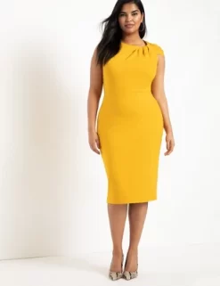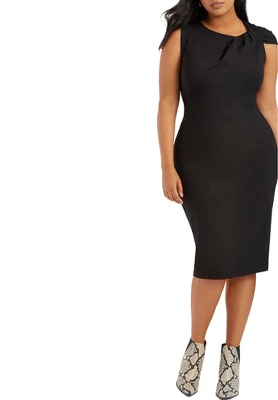 Twisted shoulder sheath dress Close fit Column fit from hip to sweep Sleeveless Center back exposed zipper Hits below knee Stretch knit ponte fabric Length on model is 45″ Models are size 14 and range in height from 5’9″-5’10″70% Rayon / 26% Nylon / 4% SpandexCare: Machine wash cold gentle cycle with like colors. Only non-chlorine bleach when needed. Tumble dry low. Cool iron as needed.