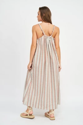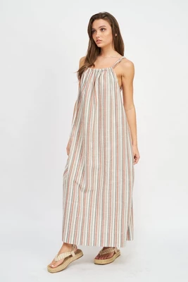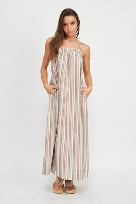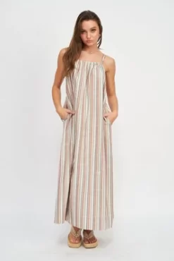 Get ready for summer with this must have sleeveless maxi dress from Emory Park. Featuring a flattering halter front neckline, deep front pockets and a comfortable fit throughout. Made with a durable, soft, striped linen fabric that is perfect for any day of summer. Pair with flats, tennis shoes or sandals to complete your look.