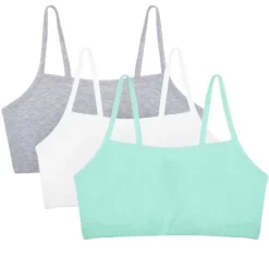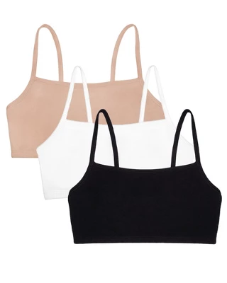 Basics bras for ladies are a wardrobe essential. The Fruit of the Loom Womens Spaghetti Strap Cotton Sports Bras can be layered under any shirt for a pop of color or additional coverage and support. These cotton pullover bras are perfect for everyday wear, designed with easily to hide spaghetti style straps and soft, stretch fabric for a comfortable and flexible fit. A comfortable and lightweight alternative to an underwire bra, the Fruit of the Loom Womens Spaghetti Strap Cotton Sports Bra includes 3 pullover sports bras perfect for everyday wear or low impact workouts. Layer the bras for added support and a strappy look.Wire-free bras designed with soft, stretch cotton for a flexible fit plus 2-ply construction that comfortably hugs and supports while offering modesty without padding. Cami bra style works well under low cut necklines and spaghetti bra straps hide easily under clothing. The ultimate comfort bras, weve thought of everything including a tag-free and hardware-free design. No itchy tags or metal slides on these bras. Our Unconditional Guarantee ensures that you get the best product every time or your money back. So run, jump, bike, or sprint happy with Fruit of the Loom. Additional colors available.
