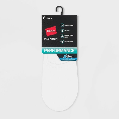 Hanes Premium Performance 6-pack Lightweight Invisible Liners have non-slip heels to keep socks in place for all day stay. Compression arch gives a performance fit around the foot. Wicking Cool Comfort® fabric helps keep feet cool and dry. With X-temp® More than Cool® technology, these socks are designed to adapt to body temperature for all day comfort. Lightweight, non cushioned support for comfort without bulk and sneaker cut to remain invisible in shoes.