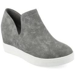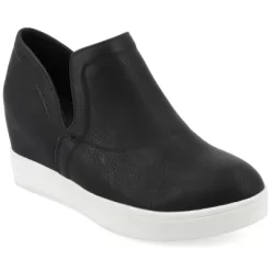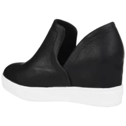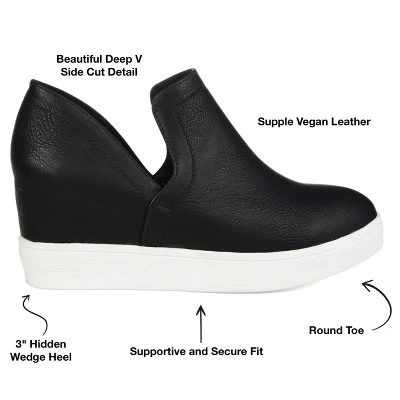 Get the perfect combination of chic and comfort with the Cardi wedge-heeled sneaker by Journee Collection. The deep “V” side cutouts, slip-on design, and rounded toe shape create a trendy but casual look you can mix and match with dresses and sweats alike. This sneaker features vegan leather, a wide-width footbed, and a padded insole, ensuring all-day comfort.