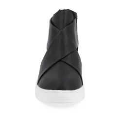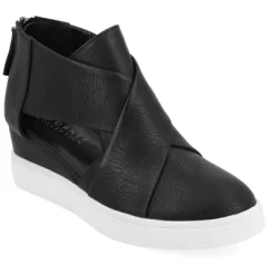 Look effortlessly cool in fashion sneakers from Journee Collection. Soft faux leather uppers display a crisscross design on the vamps and stylish D’Orsay cut-outs at the sides. Thick outsoles and wedge heels create stylish lift to finish the look At Journee Collection, our athleisure styles provide basic comfort and will have your outfits looking as good as ever. They will take you from dull to sharp in no time.