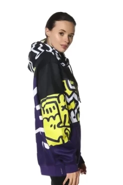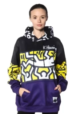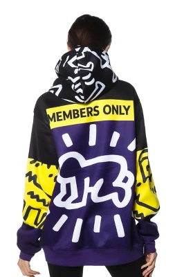 Be different and be irreplaceable by choosing this Women’s Keith Haring X Members Only Oversized Hoodie Jacket. Offered in purple color, this women’s jacket has yellow and white prints that make it look more elegant and stylish. It also has a Kangaroo pocket and embossed logo eyelet.