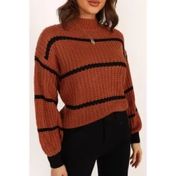 The perfect knit sweater for winter, this high round neckline piece features long sleeves with ribbed cuffs and a ribbed hem. Its relaxed fit means you can wear it all day in total comfort, while the tan stripe print adds a stylish touch that’s sure to turn heads.