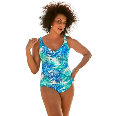This swimsuit is crafted with a sweetheart neckline and a shirred sarong overlay. Full shelf bra for bust support, adjustable straps. Power-mesh lining for tummy control.