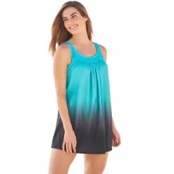 Feminine shirring combined with alluring ombré hues, this scoop neck swim dress features a detached brief with fully lined power-mesh lining for tummy control and adjustable straps. Power-mesh lining. Soft cups.