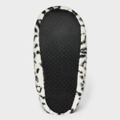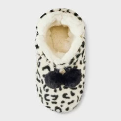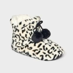 Keeping your feet toasty when the cold weather hits with these Leopard Faux-Fur Booties with Poms and Grippers. These ankle booties feature a fluffy faux-fur construction with a black and ivory leopard pattern plus pompom tie details at front for a playful finish. The cozy faux-shearling lining with cushioned insoles keeps your feet cozy, while the grippers on the soles provide a nonslip grip to let you move from room to room with ease.