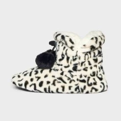 Keeping your feet toasty when the cold weather hits with these Leopard Faux-Fur Booties with Poms and Grippers. These ankle booties feature a fluffy faux-fur construction with a black and ivory leopard pattern plus pompom tie details at front for a playful finish. The cozy faux-shearling lining with cushioned insoles keeps your feet cozy, while the grippers on the soles provide a nonslip grip to let you move from room to room with ease.