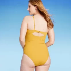 Show off your on-trend swim style wearing this Asymmetric Twist One-Piece Swimsuit from Shade & Shore™. This asymmetric one-piece swimsuit is designed to offer medium coverage. Fashioned in a solid gold color, it features a supportive underwire design with one shoulder and a twisted front or chic style. The stretchy fabric with elastic at the leg openings provides easy movement, and the keyhole back with an adjustable strap and a hook-and-loop fastener makes it easy to find just the right fit.