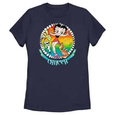 - Strut your stuff with this stylish new women’s t-shirt that is perfect for Cancer season! Featuring Betty Boop and Pudgy at the beach with a crab pulling on her skirt and the Cancer birthdates at the bottom.