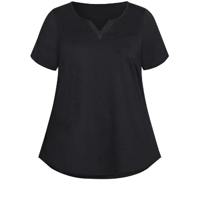 Every wardrobe needs the perfect black top, and the Split Neck Top is here to fill that role! This relaxed shape is a comfortable everyday option with its chest pocket and 100% Cotton fabrication, finished with short sleeves.Everyday style made easy, Avenue is your one-stop-shop for plus size fashion. Inspired by a comfort-meets-style approach, this effortless brand marries relaxed silhouettes with dynamic prints and colors. From casual daywear to staple denim, Avenue has simplified your everyday dressing. Take your day-to-day look to new heights with comfortable basics or eye-catchingly printed pieces, all designed to keep you comfortable while flaunting your curves to perfection. Avalable in sizes 14 – 40.