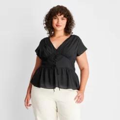 Move through any occasion in easy, breezy style with this Short-Sleeve V-Neck Corset Top from Future Collective™ with Reese Blutstein. Tailored in a classic fit, this short-sleeve corset top features a V-neckline and crisscross tie design for a unique look. The lightweight fabric and side zipper offer a comfortable fit, while the below-waist length allows for multiple styling options.