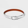 Put the finishing touch on dressy and casual looks alike with the Solid Horseshoe Belt from Universal Thread™. This women’s belt has a simple, classic look with its solid color and faux-leather material. A horseshoe-shaped buckle adds a little dimension, along with some shine from its gold-tone hardware. Multiple holes along the belt make it easy to adjust the fit to work equally well with bottoms that hit at the hip and high-waisted bottoms, and it can even be worn around the waist of a dress to create a chic, cinched-in look.