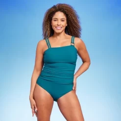 This Aqua Green one piece offers a modern take on fun and flirty, with an asymmetric neckline and double strap detail that’s both flattering and trend-right. This swimsuit features a sleek square hardware piece to elevate your look, while removable cups provide more coverage and support to ensure all day comfort by the beach or pool.