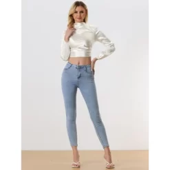 Allegra K Women’s Mock Neck Long Sleeve Ruched Satin Crop Top