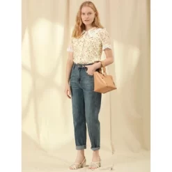 Allegra K Women’s Peter Pan Collar Contrast Puff Sleeve Plaid Blouse